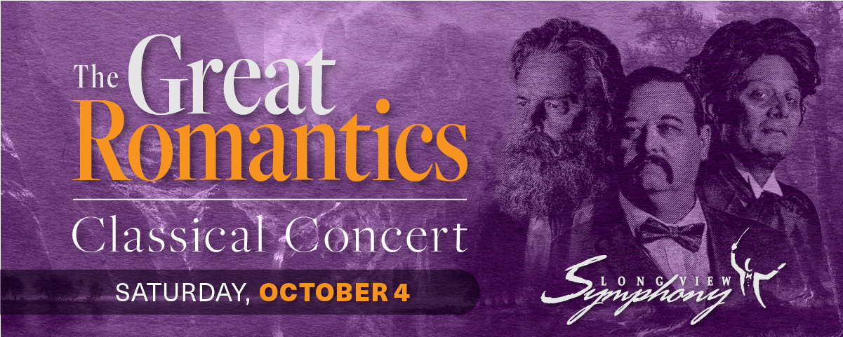 Join the Longview Symphony Orchestra for an evening celebrating The Great Romantics. The program features three giants of the era: Brahms, Mendelssohn, and Borodin. Experience Mendelssohn's brilliant and lyrical Violin Concerto, followed by Brahms's triumphant and serene Symphony No. 2. Experience the unbridled passion and genius of these composers as we bring these Romantic masterpieces to life.